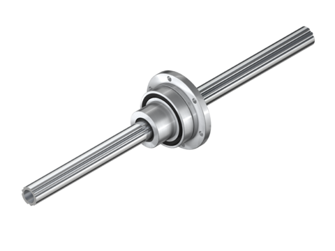 Ball Splines der Baureihe FSR sind mit einer antreibbaren Ball Spline Mutter ausgestattet. Die Mutter wird über den Flansch fest mit der Applikation verschraubt, während der innere Teil der Mutter dank des Lagers gegenüber dem Flansch drehbar bleibt. Die Mutter wird dann z.B. über eine Riemenscheibe mit einem Servo-Motor verbunden, über den Mutter und Spindel in Rotation versetzt werden können.