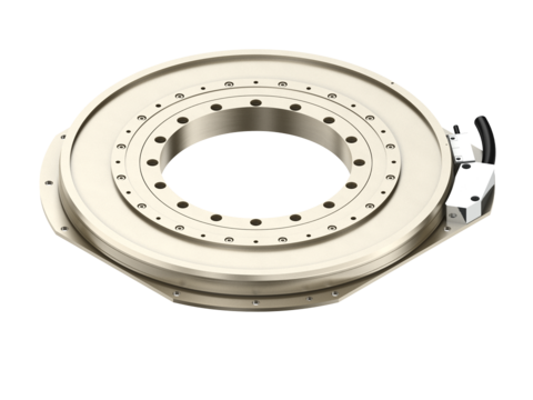 Ultraflacher Rundtisch mit großer Hohlwelle. In der Halbleiterfertigung und Inspektion eingesetzt, eignen sich die extrem flachen, dynamischen und wartungsfreien Drehachsen für Anwendungen in denen eine hohe Positioniergenauigkeit und Gleichlaufgüte gefordert ist. Die kippsteife, spielfreie Konstruktion erreicht trotz geringer Höhe eine hohe Drehmomentdichte. Die hochauflösenden Encoder stehen als inkrementelle Ausführung oder mit absoluter Schnittstelle zur Verfügung. Die große Hohlwelle erlaubt das Durchführen von ganzen Wafern bis 12 Zoll Größe oder Anwendungen mit Durchlicht.